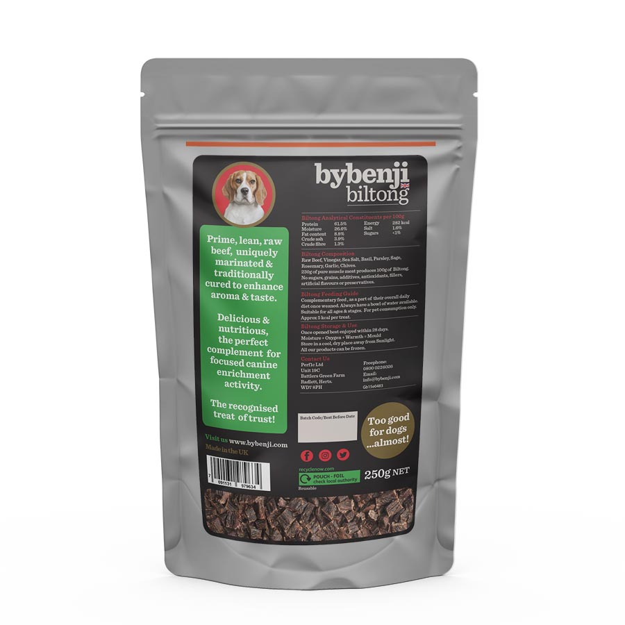 The 250g sized pouch is the ideal size not only for larger breeds but for multi dog households. As all our pouches are resealable, you can decant , fill up a treat jar and still have plenty to store.